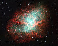 A supernova explosion and its neutron star A supernova explosion occurs when a massive star at the end of its life collapses and then explodes outward, emitting intense radiation and stellar debris to space. Such explosions scatter elements like iron, gold, silver, and plutonium out from the shattered star, which enriches surrounding space. The atmosphere of the star creates an expanding nebula, which carries most of the elements along in its wake. What's left of the star (the remaining core materials) collapse to become a "neutron star" (a dense, hot object made entirely of neutrons). If the neutron star is extremely dense, it could collapse to become a black hole. Astronomers estimate that a supernova explosion takes place once every few decades in a galaxy like the Milky Way. There are actually two stars at the center of the Crab Nebula, one of which is the neutron star. It rotates rapidly, at a rate of 33 times per second, and emits radio waves, x-rays and gamma rays out in streams of radiation. We see the x-ray and gamma-ray streams as rapidly changing pulsations in the intensity of the radiation. It's similar to watching beams from a lighthouse as the light spins around. This pulsing appearance led scientists to call the central star and its beam the Crab Pulsar. The Subaru telescope is an 8.2 meter optical-infrared telescope on Mauna Kea, Hawaii, operated by the National Astronomical Observatory of Japan, a member institute of Japan's National Institutes of Natural Science. Community Email This Article Comment On This Article Related Links Subaru Stellar Chemistry, The Universe And All Within It Space Telescope News and Technology at Skynightly.com