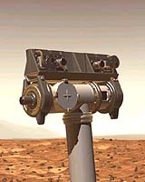 Moffett Field - Sep 09, 2003 Like all good exploration vessels, each of the Mars Exploration Rovers, Spirit and Opportunity, includes a mast. Instead of a crow's nest and a lookout, however, the rover mast-a little more than a meter tall-is topped by a pair of cameras-collectively called the Pancam (panoramic camera)-that can image the scene around the rover as sharply as a person with 20-20 vision. The Pancam's two lenses aim slightly inward from parallel, allowing twin images to be used as a stereo pair, showing the scene in three dimensions. And the whole camera head can rotate 360 degrees, as well as tilting up and down 90 degrees. The Pancam design began, literally, from the ground up. "The governing requirement was that we be able to take images of potential obstacles about the size of the wheels of the rover about 100 meters away," says Jim Bell, Pancam lead scientist and an astronomer at Cornell University. Beginning with that requirement-and some cost constraints-the scientists designed the Pancam's one-megapixel digital "film," a charge-coupled device (CCD) similar to those used in consumer digital cameras. The same space-certified CCD is used on other rover cameras as well. The requirement of being able to make a sharp image at a distance also determined the Pancam lenses' focal lengths, about the same as a moderate telephoto lens on a consumer digital camera or a 110-mm lens on a 35-mm-film camera. "Each image is just going to cover a very small part of the landing site," Bell says, "so it will take literally hundreds of images to make these beautiful mosaics." Onboard software will perform some image correction similar to what astronomers normally do with astronomical images. This software will also compress the image data using a method similar to those used for serving images on websites. Finally, ground-based software will help researchers stitch hundreds of images into mosaics, for example an uninterrupted 360-degree panorama. The rover's navigation cameras will do most of the range finding, telling the computer how far away objects are. But the Pancam may also prove useful as a rangefinder in certain circumstances. "The niche for Pancam is range finding at far distances, because we have much better resolution than the other cameras," Bell says. With its sharper resolution, the Pancam can make sharper images of distant objects for the rover to investigate-or to avoid. The CCD used in the rovers cannot record color. To produce a true-color image, the Pancam must take three photos, each with a different-color filter. Pancam includes eight filters per lens (all of the optics are protected by sapphire lens covers), so in addition to true-color images it can make images at various wavelengths, including those slightly beyond the range of human vision in both the ultraviolet and the infrared parts of the spectrum. "We're looking to use the color information to help determine the composition, especially of iron-bearing minerals that have very small changes in their colors in the infrared wavelengths beyond where the human eye is sensitive," Bell says. Iron is important to Mars geologists because it provides clues to the history of the rocks and soils, perhaps implicating watery environments that could have harbored life. Each lens also includes a special filter allowing the Pancam to image the Sun directly. To color calibrate the cameras, rover designers included a calibration target with three gray regions of varying darkness, color patches that reflect blue, green, red and near infrared, and a central post that will cast a shadow, allowing the scientists to determine the color cast created by sky light, as opposed to sunlight. The calibration target can also act as a sundial for K-12 education purposes. In addition to showing individual rocks and distant dunes, the Pancam's photo mosaics will reveal how wind or surface water may have shaped the Martian landscape. The Pancam images will be the best-ever pictures of the Mars landscape, Bell says. The Pancam "is about three times higher resolution than the Mars Pathfinder and the Viking landers' highest-resolution mode. These are very close to 20-20 human vision resolution." "We land on January 4 [in 2004] UT or late night on the 3rd Pacific time," Bell says. "So we're hoping to be able to get some images down that first day. If not on the first day, then definitely on the second day. Immediately on landing we'll start doing the various instrument checkouts and making sure things are working well and then we can really start diving into the investigation." Community Email This Article Comment On This Article Related Links Mars Exploration Rovers SpaceDaily Search SpaceDaily Subscribe To SpaceDaily Express Mars News and Information at MarsDaily.com Lunar Dreams and more
