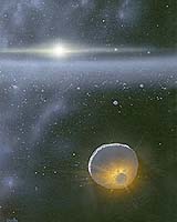 Boulder CO (SPX) Jan 12, 2005 Recently, astronomers reported the surprising discovery of a very large diameter Kuiper Belt planetoid - (90377) Sedna - on a distant, 12,500-year-long, eccentric orbit centered approximately 500 astronomical units from the Sun. Sedna's estimated diameter is about 1,600 km, two-thirds that of Pluto. Initial studies of Sedna's origin have speculated that it might have been ejected from the giant planets region of our solar system far inside the orbit of Pluto, or perhaps was captured from a passing star's Kuiper Belt. In a report published in the January 2005 issue of The Astronomical Journal, planetary scientist Dr. Alan Stern of the Space Science and Engineering Division at Southwest Research Institute (SwRI) shows Sedna could have formed far beyond the distance of Pluto. "If this is actually what happened," Stern points out, "it would indicate that our solar system's planet factory operated across a much larger region than previously thought." It would also indicate that the mysterious Kuiper Belt "edge" near 50 AU (one AU is the distance from the Earth to the Sun) is not an outer edge, but simply the inner edge of an annular trough, or gap, that is carved out of a much broader structure that has been called the "Kuiper disk." The new Sedna formation study used a planetary accretion code developed by Stern with funding from NASA's Origins of Solar System's Program in the late 1990s for studies of the formation of Kuiper Belt Objects. This software was used to explore the feasibility of building Sedna from boulder-sized and other small bodies at distances between 75 AU (Sedna's closest solar approach distance) and 500 AU (Sedna's average distance from the Sun). Stern's Sedna formation simulations assumed that Sedna's original orbit, while distant from the Sun, was circular. Astronomers agree that Sedna could not have formed in its present, eccentric orbit because such an orbit allows only violent collisions that prevent the growth of small bodies. Stern's simulations further assumed that the solar nebula - the disk of material out of which the planets formed - was much more extended than most previous simulations had assumed. "The Sedna formation simulations assumed that the primordial solar nebula was a disk about the size of those observed around many nearby middle-aged stars - like the well-known example of the 1,500-AU-wide disk around the star Beta Pictoris," Stern says. "The model calculations found that objects as large, or even larger, than Sedna could easily form in circular orbits at distances of 75 to 500 AU, and that their formation time could have been fairly short - just a few percent the age of the solar system," Stern continues. "If Sedna did form this far out, it is likely to be accompanied by a cohort of other large planetoids in this very distant region of the solar system. One telltale sign that these objects were formed where they are, rather than in another location, would be if a good fraction of them are on near circular orbits." Community Email This Article Comment On This Article Related Links SwRI SpaceDaily Search SpaceDaily Subscribe To SpaceDaily Express The million outer planets of a star called Sol