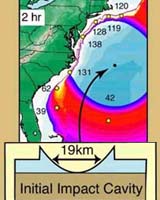 Santa Cruz - May 28, 2003 If an asteroid crashes into the Earth, it is likely to splash down somewhere in the oceans that cover 70 percent of the planet's surface. Huge tsunami waves, spreading out from the impact site like the ripples from a rock tossed into a pond, would inundate heavily populated coastal areas. A computer simulation of an asteroid impact tsunami developed by scientists at the University of California, Santa Cruz, shows waves as high as 400 feet sweeping onto the Atlantic Coast of the United States. The researchers based their simulation on a real asteroid known to be on course for a close encounter with Earth eight centuries from now. Steven Ward, a researcher at the Institute of Geophysics and Planetary Physics at UCSC, and Erik Asphaug, an associate professor of Earth sciences, report their findings in the June issue of the Geophysical Journal International. March 16, 2880, is the day the asteroid known as 1950 DA, a huge rock two-thirds of a mile in diameter, is due to swing so close to Earth it could slam into the Atlantic Ocean at 38,000 miles per hour. The probability of a direct hit is pretty small, but over the long timescales of Earth's history, asteroids this size and larger have periodically hammered the planet, sometimes with calamitous effects. The so-called K/T impact, for example, ended the age of the dinosaurs 65 million years ago. "From a geologic perspective, events like this have happened many times in the past. Asteroids the size of 1950 DA have probably struck the Earth about 600 times since the age of the dinosaurs," Ward said. Ward and Asphaug's study is part of a general effort to conduct a rational assessment of asteroid impact hazards. Asphaug, who organized a NASA-sponsored scientific workshop on asteroids last year, noted that asteroid risks are interesting because the probabilities are so small while the potential consequences are enormous. Furthermore, the laws of orbital mechanics make it possible for scientists to predict an impact if they are able to detect the asteroid in advance. "It's like knowing the exact time when Mount Shasta will erupt," Asphaug said. "The way to deal with any natural hazard is to improve our knowledge base, so we can turn the kind of human fear that gets played on in the movies into something that we have a handle on." Although the probability of an impact from 1950 DA is only about 0.3 percent, it is the only asteroid yet detected that scientists cannot entirely dismiss as a threat. A team of scientists led by researchers at NASA's Jet Propulsion Laboratory reported on the probability of 1950 DA crossing paths with the Earth in the April 5, 2002, issue of the journal Science. "It's a low threat, actually a bit lower than the threat of being hit by an as-yet-undiscovered asteroid in the same size range over the same period of time, but it provided a good representative scenario for us to analyze," Asphaug said. For the simulation, the researchers chose an impact site consistent with the orientation of the Earth at the time of the predicted encounter: in the Atlantic Ocean about 360 miles from the U.S. coast. Ward summarized the results as follows: The 60,000-megaton blast of the impact vaporizes the asteroid and blows a cavity in the ocean 11 miles across and all the way down to the seafloor, which is about 3 miles deep at that point. The blast even excavates some of the seafloor. Water then rushes back in to fill the cavity, and a ring of waves spreads out in all directions. The impact creates tsunami waves of all frequencies and wavelengths, with a peak wavelength about the same as the diameter of the cavity. Because lower-frequency waves travel faster than waves with higher frequencies, the initial impulse spreads out into a series of waves. "In the movies they show one big wave, but you actually end up with dozens of waves. The first ones to arrive are pretty small, and they gradually increase in height, arriving at intervals of 3 or 4 minutes," Ward said. The waves propagate all through the Atlantic Ocean and the Caribbean. The waves decay as they travel, so coastal areas closest to the impact get hit by the largest waves. Two hours after impact, 400-foot waves reach beaches from Cape Cod to Cape Hatteras, and by four hours after impact the entire East Coast has experienced waves at least 200 feet high, Ward said. It takes 8 hours for the waves to reach Europe, where they come ashore at heights of about 30 to 50 feet. Computer simulations not only give scientists a better handle on the potential hazards of asteroid impacts, they can also help researchers interpret the geologic evidence of past events, Ward said. Geologists have found evidence of past asteroid impact tsunamis in the form of inland sediment deposits and disturbed sediment layers in the seafloor that correlate with craters, meteorite fragments, and other impact evidence. An important feature of Ward's simulation is that it enabled him to calculate the speed of the water flows created by the tsunami at the bottom of the ocean--more than 3 feet per second out to distances of several hundred miles from the impact. "That's like a raging river, so as these waves cross the ocean they're going to stir up the seafloor, eroding sediments on the slopes of seamounts, and we may be able to identify more places where this has happened," Ward said. He added that the waves may also destabilize undersea slopes, causing landslides that could trigger secondary tsunamis. Ward has also done computer simulations of tsunamis generated by submarine landslides. He showed, for example, that the collapse of an unstable volcanic slope in the Canary Islands could send a massive tsunami toward the U.S. East Coast. A tsunami warning system has been established for the Pacific Ocean involving an international effort to evaluate earthquakes for their potential to generate tsunamis. Ward said that asteroid impact tsunamis could also be incorporated into such a system. "Tsun