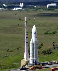 Kourou, French Guiana (SPX) Oct 12, 2005 Arianespace's upcoming Ariane 5 mission been given the go-ahead for a liftoff on October 13, with a dual payload. An Ariane 5 Generic vehicle will carry France's Syracuse 3A military telecommunications satellite, along with the multi-mission Galaxy 15 commercial telecom platform for PanAmSat of the U.S. The launch of the Syracuse 3A, initially scheduled for May, had been postponed indefinitely to the irritation of the French defense ministry, for which the satellite's orbit is a priority this year. The military communications satellite left France on May 4 for the launch base in Kourou after having aced its flight aptitude test. The Syracuse system was developed in 1985, since which several versions of the satellite have been adopted. Syracuse 3, a satellite packed with electronics reserved for the exclusive use of the French military, is designed to reinforce communications security and is said to be particularly effective against attempted interference. The Galaxy 15 satellite will provide carry an additional L-band payload as part of the U.S Federal Aviation Administration's Geostationary Communications and Control Segment (GCCS) program. Galaxy 15 will relay Global Positioning Systems (GPS) navigation to in-flight aircraft, providing highly accurate guidance to pilots at airports and airstrips where there is currently no precision landing capability. Community Email This Article Comment On This Article Related Links SpaceDaily Search SpaceDaily Subscribe To SpaceDaily Express Launch Pad at Space-Travel.com