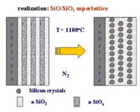 Munich - Sep 01, 2003 A technique for tailormaking silicon nanocrystals on 4-inch wafers has been developed and submitted for patent (German patent number: DE 101 04 193 A 1) by Dr. Margit Zacharias and colleagues of the Max Planck Institute of Microstructure Physics, Halle(Saale), Germany. Following a standard procedure in silicon technology, a thermally unstable silicon compound in the form of an ultra-thin layer (only two to five nanometers) is first deposited on a substrate. A subsequent thermal treatment leads to a phase separation in this layer, in which silicon clusters and nanocrystals form depending on the temperature; these clusters and crystals are embedded in a matrix of thermally stable silicon dioxide. The size of the nanocrystals is controlled via the thickness of the deposited layer. This process makes possible the cost-effective manufacture of high-density arrays of silicon clusters or nanocrystals (Solid State Phenomena 94 (3003) 95 - 104). Both Motorola and STMicroelectronics have recently announced breakthroughs based on silicon nanocrystal technology--Motorola with the first 4-megabit memory, and STMicroelectronics with light-emitting diodes (LED). Silicon, one of the base elements of our planet, is the foundation of the modern information society. Modern electronics would be unthinkable without the development of silicon transistors; such transistors are made possible only by the outstanding characteristics and stability of silicon and its oxides. However, the increasing miniaturization of microelectronics, the demands of optoelectronics, and the development of optical data transmission also show the limits of silicon technology: silicon is an indirect semiconductor and, as such, has a very inefficient light emission at room temperature. Thus, the structures most used in optoelectronics are based on the III-V elements such as gallium arsenide or indium phosphide, or corresponding combinations and are not compatible with silicon. Structures in nanometer range provide a viable solution due to the fact that silicon manifests different characteristics on the nanoscale. In a range of very few nanometers, the movement of electrons and electron vacancies in silicon is narrowly restricted, and so-called "quantum-confinement" effects appear which enlarge the band gap of silicon and shift the light emission into visible range. The possible advantages of this effect have spurred over ten years of intensive research worldwide in the field of silicon nanocrystals. The methods of manufacture are diverse, but controlling the size of the nanocrystals has remained problematic. For technological utilization it is required that the density, size, and position of the nanocrystals be controlled independently. This has not been possible with the prevailing techniques such as the manufacture of porous silicon, ion implantation, and the manufacture of thick SiOx films. Researchers at the Max Planck Institute for Microstructure Physics have recently developed a means of controlling the size of silicon nanocrystals and custom manufacturing these crystals on 4-inch wafers. The new technique is based on a combination of multi-layer structures with layer thicknesses of very few nanometers and varying band gaps, so-called "superlattices" (see Figure 1), and a phase separation in the ultra-thin layers. The superlattice structure of amorphous silicon oxide layers (SiOx/SiO2) is manufactured using a currently standard technique. The Max-Planck researchers employed a novel but simple variation of this technique by evaporating the silicon oxide either in a vacuum or in a oxygen-containing atmosphere (see Figure 1). The resulting amorphous SiO/SiO2-superlattice structure was then tempered in a nitrogen-containing atmosphere at 1100�C (2012�F). Through the thus thermally-activated phase separation, the SiO in the ultra thin sublayers transformed into pure silicon nanocrystals and into amorphous SiO2, whereby the nanocrystals were automatically surrounded with an approriate barrier material (see Figure 2). The size of the crystals within the range in question - from two to five nanometers - can be determined by the thickness of the layer. The distance between the crystals can be adjusted by varying the thickness of the SiO2 barrier layers and the oxygen content of the SiOx-layers. A higher oxygen content would automatically lead to a higher proportion of the amorphous SiO2 after the phase separation and thereby to a larger distance between the silicon nanocrystals within the sublayer. The luminescence of the silicon increases with the number of crystals, and the quantum efficiency of small crystals is higher than that of the larger; therefore, primarily very small crystals in high density are required for the highest possible luminenscence intensity. When the nanocrystal structures are implanted with erbium ions, a very effective energy transfer occurs from the nanocrystals to the Er3+-ions, and the luminescence shifts into a technologically useful range of 1.54 micrometers. This particular wavelength is of great technological importance due to the fact that the fiber optic cable employed in optical data transmission exhibits a transmission maximum at 1.54 micrometers. Additionally, erbium-doped glass fiber is used as an amplifier for the optical data transmission. In autumn of 2002 STMicroelectronics introduced a light-emitting diode based on nanocrystalline silicon which operates at 1.54 micrometers with a efficiency factor of 10 percent. This technology still relies on the standard technique of ion implantation which produces and randomly distributes silicon crystals in thick Si02 layers. This efficiency factor could be exceeded by using the new technique to produce structures containing a dense matrix of crystals only 2 nanometers in size. Memory circuitry is a further area of application of silicon nanocrystals in oxide matrices. Thus, Motorola recently introduced the first 4-megabit memory, wh