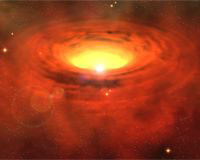 Bonn, Germany (SPX) May 28, 2008 By resolving, for the first time, features of an individual star in a neighbouring galaxy, ESO's VLT has allowed astronomers to determine that it weighs almost half of what was previously thought, thereby solving the mystery of its existence. The behemoth star is found to be surrounded by a massive and thick torus of gas and dust, and is most likely experiencing unstable, violent mass loss. WOH G64 is a red supergiant star almost 2 000 times as large as our Sun and is located 163 000 light-years away in the Large Magellanic Cloud, one of the Milky Way's satellite galaxies. "Previous estimates gave an initial mass of 40 times the mass of the Sun to WOH G64. But this was a real problem as it was way too cold, compared to what theoretical models predict for such a massive star. Its existence couldn't be explained," says Keiichi Ohnaka, who led the work on this object. New observations, made with ESO's Very Large Telescope Interferometer, conclude that the gas and dust around the star is arranged in a thick ring, rather than a spherical shell, and the star is thus less hidden than had been assumed. This implies that the object is in fact half as luminous as previously thought, and thus, less massive. The astronomers infer that the star started its life with a mass of 25 solar masses. For such a star, the observed temperature is closer to what one would expect. "Still, the characteristics of the star mean that it may be experiencing a very unstable phase accompanied by heavy mass loss," says co-author Markus Wittkowski from ESO. "We estimate that the belt of gas and dust that surrounds it contains between 3 and 9 solar masses, which means that the star has already lost between one tenth and a third of its initial mass." To reach this conclusion, the team of astronomers used the MIDI instrument to combine the light collected by three pairs of 8.2-m Unit Telescopes of the VLT. This is the first time that MIDI has been used to study an individual star outside our Galaxy. The observations allowed the astronomers to clearly resolve the star. Comparisons with models led them to conclude that the star is surrounded by a gigantic, thick torus, expanding from about 15 stellar radii (or 120 times the distance between the Earth and the Sun - 120 AU!) To more than 250 stellar radii (or 30 000 AU!). "Everything is huge about this system. The star itself is so big that it would fill almost all the space between the Sun and the orbit of Saturn," says Ohnaka. "And the torus that surrounds it is perhaps a light-year across! Still, because it is so far away, only the power of interferometry with the VLT could give us a glimpse on this object. " Notes: The name WOH G64, refers to the fact that it is the 64th entry in the catalogue by Westerlund, Olander, and Hedin, published in 1981, and based on observations made at ESO La Silla. The team is comprised of K. Ohnaka, T. Driebe, K.-H. Hofmann, G. Weigelt (Max-Planck Institute for Radio Astronomy, Bonn, Germany), and M. Wittkowski (ESO). "Spatially resolved dusty torus toward the red supergiant WHO G64 in the Large Magellanic Cloud", by K. Ohnaka et al., Astronomy and Astrophysics, 484, 371. Community Email This Article Comment On This Article Share This Article With Planet Earth