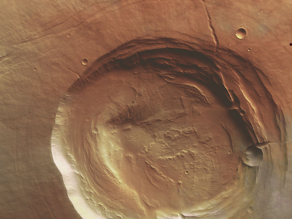 Paris (ESA) Sep 08, 2005 These images, taken by the High Resolution Stereo Camera (HRSC) on board ESA's Mars Express spacecraft, show the Biblis Patera volcano, located in the western part of the Tharsis rise on Mars. The HRSC obtained these images during orbit 1034 with a ground resolution of approximately 10.8 metres per pixel. The scenes show the region of Biblis Patera, at approximately 2.0� North and 236.0� East. Located between Olympus Mons and Tharsis Montes, the volcano Biblis Patera is 170 kilometres long, 100 kilometres wide and rises nearly three kilometres above its surroundings. The bowl-shaped depression (the 'caldera') may have been formed as the result of collapse of the magma chamber during eruptions of the volcano. The caldera has a diameter of 53 kilometres and extends to a maximum depth of roughly 4.5 kilometres. The morphology of the caldera suggests that multiple collapse events have occurred.The radial depressions and faint concentric circles on the flanks of the volcano are most likely faults associated with the formation of Biblis Patera. In the south-west (top left), the linear features extending north-west to south-east appear to be faults. Surrounding Biblis Patera there are more faults with a similar orientation and which may be related to the formation of the Tharsis Rise. Biblis Patera is older than the surrounding plains, which consist of lava flows originating from Pavonis Mons (the middle one of the Tharsis Montes volcanoes). In the main colour image, clouds obscure the surface to the north-east of the caldera (bottom right), making it appear grey and less reddish-orange in colour. The stereo and colour capability and the high-resolution coverage of extended areas with the HRSC allow the improved study of the complex geological evolution of the Red Planet. By supplying new image data for volcanoes like Biblis Patera, the HRSC provides scientists with the opportunity to better understand the morphology and volcanic history of Mars. Data from the HRSC, coupled with information from other instruments on Mars Express and other missions, improves our understanding of this fascinating planet. The colour images were processed using the HRSC nadir (vertical view) and three colour channels. The perspective view was calculated from the digital terrain model derived from the stereo channels. The 3D anaglyph image was created from the nadir channel and one of the stereo channels. Stereoscopic glasses are needed to view the 3D image. Image resolution has been decreased for use on the internet.
