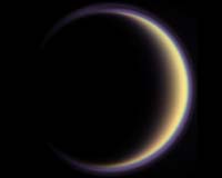 Pasadena CA (JPL) Sep 25, 2006 With its thick, distended atmosphere, Titan's orange globe shines softly, encircled by a thin halo of purple light-scattering haze. Images taken using blue, green and red spectral filters were used to create this enhanced-color view; the color images were combined with an ultraviolet view that makes the high-altitude, detached layer of haze visible. The ultraviolet part of the composite image was given a purplish hue to match the bluish-purple color of the upper atmospheric haze seen in visible light. Small particles that populate high hazes in Titan's atmosphere scatter short wavelengths more efficiently than longer visible or infrared wavelengths, so the best possible observations of the detached layer are made in ultraviolet light. The images in this view were taken by the Cassini narrow-angle camera on May 5, 2005, at a distance of approximately 1.4 million kilometers (900,000 miles) from Titan and at a sun-Titan-spacecraft, or phase, angle of 137 degrees. Image scale is 8 kilometers (5 miles) per pixel. Community Email This Article Comment On This Article Related Links Explore The Ring World of Saturn and her moons Explore The Ring World of Saturn and her moons Jupiter and its Moons The million outer planets of a star called Sol News Flash at Mercury