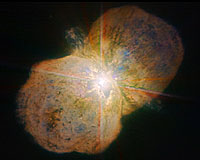 Paris, France (ESO) May 28, 2008 On the occasion of the 10th anniversary of the Very Large Telescope's First Light, ESO is releasing two stunning images of different kinds of nebulae, located towards the Carina constellation. The first one, Eta Carinae, has the shape of a 'little man' and surrounds a star doomed to explode within the next 100 000 years. The second image features a much larger nebula, whose internal turmoil is created by a cluster of young, massive stars. Being brighter than one million Suns, Eta Carinae is the most luminous star known in the Galaxy. It is the closest example of a luminous blue variable, the last phase in the life of a very massive star before it explodes in a fiery supernova. Eta Carinae is surrounded by an expanding bipolar cloud of dust and gas known as the Homunculus ('little man' in Latin), which astronomers believe was expelled from the star during a great outburst seen in 1843 [1]. Eta Carinae was one of the first objects to be imaged during First Light with ESO's VLT, 10 years ago. At the time, the image obtained with a test camera already showed the unique capabilities of the European flagship telescope for ground-based optical and infrared astronomy, as well as of its unique location on the mountain of Paranal. The image had a resolution of 0.38 arcseconds. The new, recently obtained image reveals even more, with a resolution a factor of 6 to 7 times better. It was obtained with the NACO near-infrared instrument on Yepun, Unit Telescope 4 of the VLT. NACO is an adaptive optics instrument, which means that it can correct for the blurring effect of the atmosphere. And looking at the image, the power of adaptive optics is clear. The image quality is as though the whole 8.2-m telescope had been launched into space [2]. When viewed through the eyepiece of a small telescope, the Homunculus may indeed resemble a little man, but the astounding NACO image clearly shows a bipolar structure. Also very well resolved is the fine structure of the jets coming out from the central star. Last year, the Very Large Telescope Interferometer also studied Eta Carinae in great detail and provided invaluable information about the stellar wind of Eta Carinae (see ESO 06/07). The second image was obtained with the ISAAC infrared imager on Antu, Unit Telescope 1. Located 9 000 light-years away, i.e. farther away than Eta Carinae, NGC 3576 is also in the direction of the southern Carina constellation. NGC 3576 is about 100 light-years across, that is, 25 times larger than the distance between the Sun and its closest neighbouring star. This intriguing nebula is a gigantic region of glowing gas, where stars are currently forming. The intense radiation and winds from the massive stars are shredding the clouds from which they form, creating dramatic scenery. It is estimated that the nebula is about 1.5 million year old, the blink of an eye on cosmological timescales. Astronomers from the University of Cologne [3], Germany, have studied this region with ESO's Very Large Telescope and ISAAC to determine the proportion of stars still having a protoplanetary disc from which planets form. Looking at young regions of different ages, the astronomers hope to estimate the lifetime of protoplanetary discs and thereby better understand how planets form. In particular, the scientists are interested in looking at the effect of the strong radiation of the stars, as well as of stellar encounters in these dense regions, on the survival of the discs. Notes: [1]: In fact, since the distance to Eta Carinae is about 7500 light-years, the eruption must have taken place about 7700 years ago. [2]: Given the large size of each Unit Telescope of the VLT, the resolution achievable when using adaptive optics (the 'diffraction limit') is as good in the longer near-infrared wavelengths, where NACO observes, as what the HST can achieve in the visible. The resolution is indeed close to 0.05 arcseconds, ten times better than what one can typically obtain without adaptive optics on an excellent site. A resolution of 0.05 arcseconds corresponds to being able to read a book 10 km away. [3]: The astronomers are C. Olczak, R. Schodel, S. Pfalzner, and A. Eckart. Community Email This Article Comment On This Article Share This Article With Planet Earth
