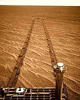 Pasadena CA (JPL) Feb 01, 2005 Since landing on Mars a year ago, NASA's pair of six-wheeled geologists have been constantly exposed to martian winds and dust. Because the rovers use solar power and sunlight is currently limited on Mars, the rovers can only cover from 50 to 100 feet on a good day. The sunlight is seasonal and also power-limiting as the rover's age and get covered by dust. Among the failure models for eventually retiring the rovers, an electronic glitch or dust accumulation are most likely than a mechanical breakage. Both rovers have been coated by some dust falling out of the atmosphere during that time, with estimates of the dust thickness ranging from 1 to 10 micrometers, or between 1/100th and 1/10th the width of a single human hair. Of the two, NASA's Mars Exploration Rover Spirit is definitely the more dust-laden. The Opportunity rover appears to be collecting less dust, perhaps because of a cleaning by wind or even "scavenging" of dust by frost that forms on the rover some nights during the martian winter. In imagining the texture of the rocks found by the Opportunity rover, the mission team has compared them to spongy sandstone. They are pockmarked, porous, dried and cracked. The voids and holes in these spongy rocks may have arisen from repeated cycles of evaporation to harden the surfaces followed by a washing away to dissolve the more soluble interior portions. NASA's Mars Exploration Rover Spirit is definitely the more dust-laden. As a result, Spirit has gradually experienced a decline in power as the thin layer of dust has accumulated on the solar panels, blocking some of the sunlight that is converted to electricity. The panoramic camera team's analysis indicates that the layer of dust on Spirit's calibration target is about 70 percent thicker than that on Opportunity's. Prior to this mission, the Meridiani plains were compared to the Rust Belt states, those in the middle north of America (Michigan, Ohio, Pennsylvania). The other comparison was to the red dirt found in Oklahoma and northern Texas--the so-called Red River region. In addition to red dirt, the rovers have found bedrock. On earth, bedrock is common in northern New England, particularly Maine and New Hampshire, the Granite state. But the wind blows around enough dry dust on Mars to cover what might be exposed bedrock. This debris layer blankets most of the rest of the planet. Additionally, meteors have pulverized the martian surface leaving a thick crushed layer. A portion of Mars' water vapor is moving from the north pole toward the south pole during the current northern-summer and southern-winter period. The transient increase in atmospheric water at Meridiani, just south of the equator, plus low temperatures near the surface, contribute to appearance of the clouds and frost. Frost shows up some mornings on the rover itself. The possibility that it has a clumping effect on the accumulated dust on solar panels is under consideration as a factor in unexpected boosts of electric output from the panels. The atmosphere of Mars contains water, but in miniscule amounts. "Even though we are currently seeing frequent clouds with Opportunity, if you squeezed all of the water out of the atmosphere, it would only be less than 100 microns deep, about the thickness of a human hair," said Mark Lemmon of Texas A&M University's College of Geosciences. Because of the lack of water, weather on Mars has a lot to do with dust in the atmosphere. A small dust storm one month before the rovers landed spread small amounts of dust around the planet. "Both rovers saw very dusty skies at first. It was only after the dust settled after a few months that Spirit could see the rim of the crater it was in, Gusev Crater, about 40 miles away," Lemmon said. British scientists have speculated that the British Mars Lander, Beagle 2, crashed because the atmosphere was thinner than usual as a result of heating caused by atmospheric dust from the December storm. "I can think of at least three things could kill us," said Cornell's principal investigator for the Mars rovers, Steve Squyres, when discussing the mission lifetime with the Astrobiology Magazine. "The first is dust build-up on the solar arrays. But the dust build-up is not that bad, especially for Opportunity, and with spring approaching both vehicles should do ok for awhile." "The second thing is if something mechanical goes wrong," said Squyres. "The rovers have a lot of moving parts, and we've seen a few mechanical funnies on Spirit. Nothing serious, but enough to catch your attention. Stuff could just wear out." "The third thing is, we've got a lot of single-string electronics in these vehicles," said Squyres. "There's not a lot of redundancy. Now, we have the ultimate redundancy in that there are two vehicles. But within each rover there are a lot of electrical parts that, if they just flat-out fail on us, the rover's dead. Bang! It just dies overnight and never talks to us again. That could happen." Community Email This Article Comment On This Article Related Links Mars Rovers at JPL Mars Rovers at Cornell SpaceDaily Search SpaceDaily Subscribe To SpaceDaily Express Mars News and Information at MarsDaily.com Lunar Dreams and more