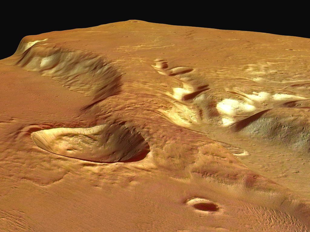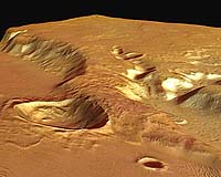 Paris (ESA) Mar 30, 2005 These images, taken by the High Resolution Stereo Camera (HRSC) on board ESA's Mars Express spacecraft, show part of the Medusa Fossae formation and adjacent areas at the highland-lowland boundary on Mars. The HRSC obtained these images during orbit 917 with a resolution of approximately 13 metres per pixel. The scenes show an area located at about 5� South and 213� East. The Medusa Fossae formation is an extensive unit of enigmatic origin found near the Martian 'highland-lowland dichotomy boundary' between the Tharsis and Elysium centres of volcanic activity. This dichotomy boundary is a narrow region separating the cratered highlands, located mostly in the southern hemisphere of Mars, from the northern hemisphere's lowland plains. The cratered highlands stand two to five kilometres higher than the lowland plains, so the boundary is a relatively steep slope. The processes that created and modified the dichotomy boundary remain among the major unanswered issues in Mars science. The boundary between the old volcanic plateau region and part of the widespread deposits of the Medusa Fossae formation, called Amazonis Sulci, is shown in this image. In general, the formation appears as a smooth and gently undulating surface, but is partially wind-sculpted into ridges and grooves, as shown in the mosaic of nadir images. It is commonly agreed that the materials forming Medusa Fossae were deposited by pyroclastic flows or similar volcanic ash falls. The plateau walls of the volcanic massif are partly covered by lava flows and crossed in places by valleys which were most likely carved by fluvial activity. The remains of water-bearing inner channels are visible in the centre of the valleys and at the bottom of the massif. Superposition of the lobe-fronted pyroclastic flows indicates that the water erosion ended before their deposition. Later, a 'bolide' impacted near the massif and the ejecta blanket was spread as a flow over parts of the plateau, implying water or ice was present in the subsurface at the time of impact. A bolide is any extraterrestrial body in the 1-10 kilometre size range, which impacts on a planetary surface, explodes on impact and creates a large crater. This is a generic term, used when we do not know the precise nature of the impacting body, whether it is a rocky or metallic asteroid, or an icy comet, for example. The colour images have been derived from the three HRSC colour channels and nadir channel. The perspective views have been calculated from the digital terrain model derived from the stereo channels. The anaglyph image was calculated from the nadir and one stereo channel. Image resolution has been decreased for use on the internet. The highland-lowland boundary. Here the volcanic plateau fed by the southernmost Tharsis Montes volcano Arsia Mons, is dissected by several valleys which were most likely carved by running water. Here the Senus Vallis is shown in detail as an example where the latest-stage inner channel is still visible. This is the mouth of Abus Vallis, a channel of the same type as in Detail 1. Here the walls are too steep or the valley too narrow to look down to the bottom of the channel due to insolation and shading of the image, but the remains of the last stage of water activity can be traced as a small channel at the floor of the lowland plain. Additionally the emplacement of pyroclastic flows is visible in this detail. It shows that the action of water erosion ended before the emplacement of the pyroclastic flow. An impact crater is the youngest feature of the 'stratigraphic' sequence (layers of rocks produced over time) which can be observed in this image. This crater has a well preserved ejecta blanket with a 'lobate' (lobe-like) appearance, which is believed to indicate the presence of water or water ice in the impacted target. As a crater forms on a flat surface, it expands in a circular fashion. Due to the topography of the impact site the shape of the crater during expansion was disturbed by the walls of the plateau and resulted in an asymmetrical shape. The distribution of ejecta, resembling the wings of a butterfly, is due to a non-vertical impact (less than 45 degrees). The Amazonis Sulci, with its ridges and grooves, appears to be wind-sculpted. The lack of craters superposing this surface indicates that wind erosion has been the latest stage of eroding processes acting here. Community Email This Article Comment On This Article Related Links Mars Express at ESA SpaceDaily Search SpaceDaily Subscribe To SpaceDaily Express Mars News and Information at MarsDaily.com Lunar Dreams and more