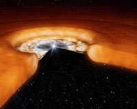 earlier related report Infant stars form from a disc of gas and dust that surrounds the new star and, later, may also provide the material for a planetary system. Because the closest star-forming regions to us are about 500 light-years away, these discs appear very small on the sky, and their study requires special techniques to be able to probe the finer details. This is best done with interferometry, a technique that combines the light of two or more telescopes so that the level of detail revealed corresponds to that which would be seen by a telescope with a diameter equal to the separation between the interferometer elements, typically 40 to 200 metres. ESO's Very Large Telescope Interferometer (VLTI) has allowed astronomers to reach a resolution of about a milli-arcsecond, an angle equivalent to the size of the full stop at the end of this sentence seen from a distance of about 50 kilometres. "So far interferometry has mostly been used to probe the dust that closely surrounds young stars," says Eric Tatulli from Grenoble (France), who co-led this international project. "But dust is only one percent of the total mass of the discs. Their main component is gas, and its distribution may define the final architecture of planetary systems that are still forming." The ability of the VLTI and the AMBER instrument to take spectra while probing objects at milli-arcsecond resolution has allowed astronomers to map the gas. Astronomers studied the inner gaseous environments of six young stars belonging to the family of Herbig Ae/Be objects. These objects have masses a few times that of our Sun and are still forming, increasing in mass by swallowing material from the surrounding disc. The team used these observations to show that gas emission processes can be used to trace the physical processes acting close to the star. "The origin of gas emissions from these young stars has been under debate until now, because in most earlier investigations of the gas component, the spatial resolution was not high enough to study the distribution of the gas close to the star," says co-leader Stefan Kraus from Bonn in Germany. "Astronomers had very different ideas about the physical processes that have been traced by the gas. By combining spectroscopy and interferometry, the VLTI has given us the opportunity to distinguish between the physical mechanisms responsible for the observed gas emission." Astronomers have found evidence for matter falling into the star for two cases, and for mass outflow in four other stars, either in an extended stellar wind or in a disc wind. It also seems that, for one of the stars, dust may be present closer to the star than had been generally expected. The dust is so close that the temperature should be high enough for it to evaporate, but since this is not observed, it must mean that gas shields the dust from the star's light. These new observations demonstrate that it is now possible to study gas in the discs around young stars. This opens new perspectives for understanding this important phase in the life of a star. "Future observations using VLTI spectro-interferometry will allow us to determine both the spatial distribution and motion of the gas, and might reveal whether the observed line emission is caused by a jet launched from the disc or by a stellar wind", concludes Stefan Kraus. *Original Papers: * The origin of hydrogen line emission for five Herbig Ae/Be stars spatially resolved by VLTI/AMBER spectro-interferometry, Kraus, S.; Hofmann, K.-H.; Benisty, M.; Berger, J.-P.; Chesneau, O.; Isella, A.; Malbet, F.; Meilland, A.; Nardetto, N.; Natta, A.; Preibisch, T.; Schertl, D.; Smith, M.; Stee, P.; Tatulli, E.; Testi, L.; Weigelt, G. , Astronomy and Astrophysics Volume 489, Issue 3, 2008, pp.1157-1173, and Spatially resolving the hot CO around the young Be star 51 Ophiuchi, Tatulli, E.; Malbet, F.; Menard, F.; Gil, C.; Testi, L.; Natta, A.; Kraus, S.; Stee, P.; Robbe-Dubois, S., Astronomy and Astrophysics, Volume 489, Issue 3, 2008, pp.1151-1155. Community Email This Article Comment On This Article Share This Article With Planet Earth