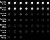 Pasadean CA (SPX) Aug 30, 2007 The mighty Mars rovers Spirit and Opportunity continue to persevere in brutal conditions, as revealed in images of the sun they are sending home. The images show how opaque the Martian atmosphere has been in the face of a raging, two-month dust storm. To understand the gravity of the storm, engineers and astronomers monitor the situation by examining the images of the sun and measuring the amount of dust or the opacity of the atmosphere. Emily Lakdawalla of the Planetary Society assembled the mosaic of images, which were taken daily by the panoramic cameras (Pancams) on both rovers, Spirit and Opportunity. The images were calibrated by students in Cornell's MarsLab image-processing facility and made available through collaboration with Jim Bell, Cornell professor of astronomy and the principal investigator on the rovers' Pancam imaging team. "Emily's mosaics are quite remarkable. They show a rover's-eye view of the storm getting worse, and this little light bulb we call the sun getting dimmer and dimmer and dimmer as the dust clouds built up," said Bell. Since June, a massive dust storm has engulfed much of the Martian surface. The storm has put the rovers in danger, as they depend upon solar power to run during the day and to survive the harsh, cold Martian nights. As dust clouds block the sunlight and dust settles on the solar panels, the rovers' energy is depleted. Only wind can remove the dust, Bell said. For the rover Spirit, the Jet Propulsion Laboratory (JPL) in Pasadena, Calif., reports that even though the Martian sky above Gusev Crater is clearing, solar power levels remained fairly low and constant dust now appears to be accumulating on the solar panels. Between sol -- a Martian day -- 1283 (Aug. 12) and sol 1286 (Aug. 16) , the atmosphere cleared by about 35 percent, leading to daily energy levels of about 300 watt-hours (the amount of energy needed to light a 100-watt bulb for three hours). Typical levels before the dust storms were around 700 to 900 watt-hours for the rovers. On the other side of Mars, Opportunity, now waiting to enter Victoria Crater from the rim, is currently experiencing its lowest power levels to date. The sky was so dark in mid-July that less than 200 watt-hours of daily energy was available, according to JPL. But skies are slowly clearing, offering hope that the rover will be ready for a descent into the crater soon. Opportunity benefited from wind blowing some dust off solar panels on Aug. 22. Under gradually clearing skies, Opportunity's solar panels were producing about 300 watt hours daily by Aug. 24. Community Email This Article Comment On This Article Related Links Mars News and Information at MarsDaily.com Lunar Dreams and more