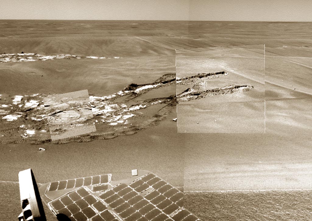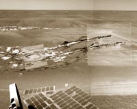Pasadena CA (SPX) Jun 26, 2006 NASA's Opportunity Mars rover remains healthy some 29 months - and 26 months beyond its designed operational lifetime - after bouncing to a stop on the red planet's surface. JPL mission controllers report the rover has started receiving a new flight software load. It also advanced 138.1 meters (453 feet) toward Victoria Crater in the Meridiani Planum region three sols, or Martian days, of driving and observing outcrop targets. As of sol 855 (June 20) Opportunity was 780 meters (just under half a mile) from Victoria and about 300 meters (984 feet) from a smaller crater controllers have dubbed Beagle. Controllers are uploading new flight software to both Opportunity and Spirit. The upload process is expected to take several weeks before the new software is installed and used. To expedite this process, the team is gradually increasing the duration of Opportunity's high-gain antenna uplink sessions. No files of the new flight software were uplinked via UHF this week, but beginning with sol 864 (June 29), Opportunity will begin receiving flight software files via its daily UHF-band communication window as well as via the X-band high-gain antenna. Sol-by-sol summaries: Sol 852 (June 17): Controllers loaded files for the new flight software via a 20-minute window of communication via the high-gain antenna. Targeted remote sensing with the panoramic camera included an assessment of the clarity of the atmosphere (a term called tau) and imaging of targets called Holberg and Blixen. The miniature thermal emission spectrometer was used for observations of Holberg, Blixen, sky and ground. Sol 853: A flight software upload used a 20-minute high-gain antenna window. The rover drove 42.1 meters (138 feet). Untargeted remote sensing included post-drive imaging by the navigation camera and the panoramic camera, an assessment of tau by the panoramic camera, a check for clouds with the navigation camera, and sky and ground observations with the miniature thermal emission spectrometer. Sol 854: Another flight software upload was accomplished during a 20-minute high-gain antenna communication window. The panoramic camera checked tau. The navigation camera looked back in the direction toward where sol 853's drive began. Sol 855: During a 30-minute high-gain antenna session, more of the new flight software was transmitted. Opportunity drove 39.4 meters (129 feet). The navigation camera and panoramic camera made observations from the new location. The panoramic camera checked tau. The miniature thermal emission spectrometer completed a sky and ground observation. Sol 856: During a one-hour window, another flight software upload was accomplished. Untargeted remote sensing included a panoramic camera observation of the ground's brightness, a panoramic camera assessment of tau, and a miniature thermal emission spectrometer observation of sky and ground. Sol 857: More flight software files were uploaded during a 30-minute high-gain antenna window. The rover drove 56.6 meters (186 feet). Opportunity also conducted a panoramic camera assessment of tau, a panoramic camera calibration, and a miniature thermal emission spectrometer observation of sky and ground. Sol 858 (June 23): A two-hour high-gain antenna session allowed for the upload of more flight software updates. The navigation camera looked back in the direction toward where sol 857's drive began. The panoramic camera checked tau and made a calibration observation. The miniature thermal emission spectrometer observed sky and ground. As of the end of its drive on sol 855 (June 20), Opportunity's odometry totaled 8,190.89 meters, or 5.09 miles. Community Email This Article Comment On This Article Related Links Mars Rovers at JPL Mars Rovers at Cornell Mars News and Information at MarsDaily.com Lunar Dreams and more