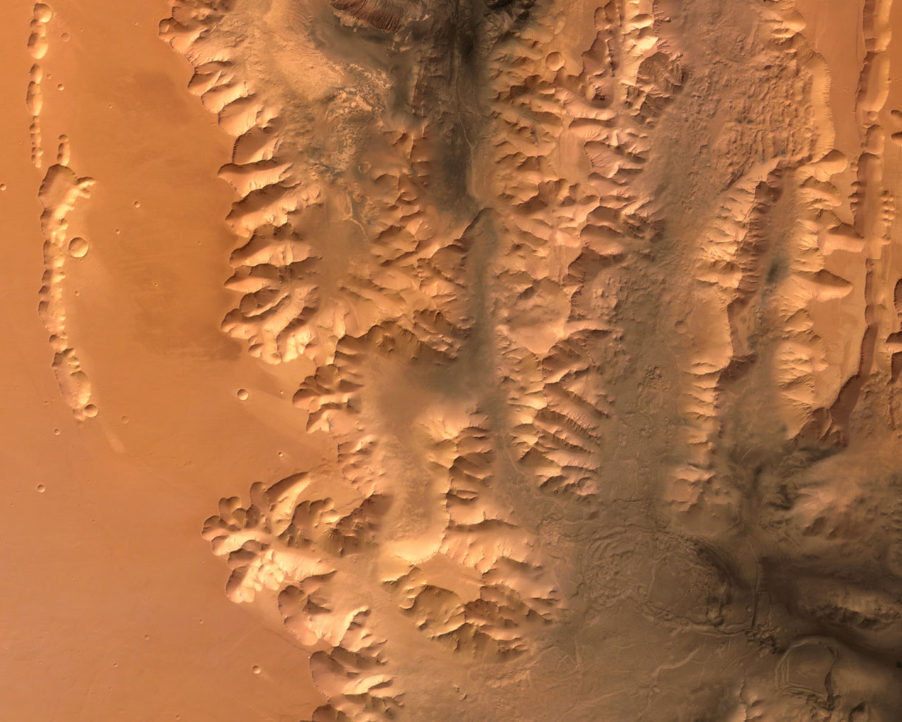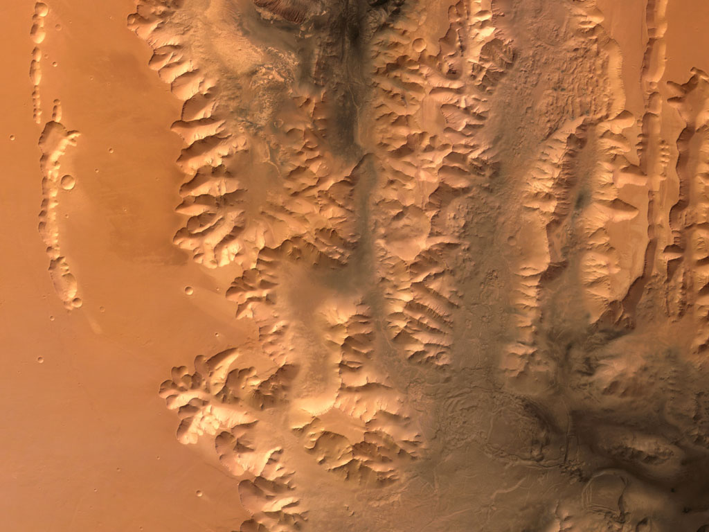 Paris, France (ESA) Nov 04, 2004 This image, taken by the High Resolution Stereo Camera (HRSC) on board ESA's Mars Express spacecraft, shows the western end of the Valles Marineris Canyon system on Mars. The image was taken during orbit 442 with a ground resolution of approximately 52 metres per pixel. The displayed region is located at the beginning of the canyon system at about latitude 7� South and longitude 269� East. The image shows the western end of the canyons Tithonium Chasma and Ius Chasma, part of the Valles Marineris canyon system, which are up to 5.5 kilometres deep. The whole canyon system itself is the result of a variety of geological processes. Probably tectonic rifting, water and wind action, volcanism and glacial activity all have played major roles in its formation and evolution. The canyon floors are covered by a dark, layered material, the so-called 'Interior Layered Deposits'. These deposits are marked by a system of polygonal cracks through which the underlying, lighter-coloured rock can be seen. The Interior Layered Deposits are still a major topic of research. Parts of the deposits are most probably volcanic, while in other areas a sedimentary origin has been proposed. The morphology of the valley flanks has been modified by 'slumping' and rockfalls. Slumping is when a substantial part of a mountain, cliff or hill 'breaks away' and slides more or less intact to the bottom of the slope. Some of the major slumps here are more than thirty kilometres wide. The flanks are often covered to a large extent by their own 'talus', or rock debris that has fallen from the sides of a cliff or steep slope. The large, deeply eroded Crater Oudemans in the south of the area (bottom of the image) has a diameter of about 120 kilometres. Around the central mount of the crater, large plains composed of dark rock can be seen. These plains are covered by lighter sediments, deposited through the action of the wind. Several systems of tectonic faults can be seen in the imaged area. The most prominent is the system of Valles Marineris itself, running east-west. South of Crater Oudemans, smaller tectonic 'grabens' running from the south-west to the north-east can be seen. To the north of the large canyons, there are more fault systems. The Valles Marineris region is one of the most studied areas on Mars. The canyon system is one of the major keys to the tectonic and volcanic history of this planet. Research on the sedimentary rocks and the products of erosion can also provide major insights into its climatic evolution. Due to the stereo capability of the HRSC, the new image data gained can provide new insights into the geology of Mars. This will lead to a new, more precise reconstruction of Martian geological history. Image resolution has been decreased for use on the internet. The colour images were processed using the nadir (vertical view) and colour channels. Community Email This Article Comment On This Article Related Links Mars Express at ESA SpaceDaily Search SpaceDaily Subscribe To SpaceDaily Express Mars News and Information at MarsDaily.com Lunar Dreams and more