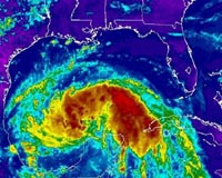 Washington (AFP) July 21, 2008 Tropical Storm Dolly churned over the Gulf of Mexico on Monday, threatening to grow into a hurricane within 24 hours as it headed toward the Mexico-Texas border, the US National Hurricane Center said. The governments of Texas and Mexico issued a hurricane watch for coastal areas, meaning they could be struck by hurricane-force conditions within 36 hours, the Miami-based center said. Dolly was packing 80 kilometer per hour (50 mph) winds after emerging from Mexico's Yucatan peninsula. The eye of the storm was about 90 kilometers (55 miles) northeast of Progreso Mexico. The storm was expected to produce two to four inches (five to 10 centimeters) of rain accumulation in northern Yucatan with isolated maximum amounts of up to six inches (15 cm), the center said. "Strengthening is forecast and Dolly could become a hurricane by tomorrow," the center said in its latest bulletin issued at 11:00 am (1500 GMT). Community Email This Article Comment On This Article Share This Article With Planet Earth