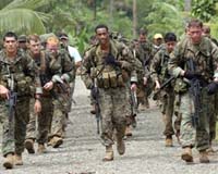 Guinsaugon, Philippines (AFP) Feb 20, 2006 The US military said Monday it was committing up to 3,000 troops to help after a huge landslide in the Philippines, as the hunt for survivors became a grim search for bodies instead. Foreign and local teams battled bad weather in the continuing search following Friday's tragedy, picking their way carefully through dangerous mud under which some 1,400 people are feared buried. Rescuers Monday located the site of a school believed to contain some 200 students and 40 teachers in the village of Guinsaugon on Leyte island. "They have discovered a trace of the school building," Joseph Chang, co-ordinator for a specialist Taiwan rescue team, told AFP, adding that crews have now pinpointed its location under tonnes of mud and rocks. But Chang said he had no idea when rescuers might be able to dig down to it. Ted Esguerra, head of a Philippine coastguard rescue team, said rescuers Monday had heard "rhythmic tapping sounds" from the site of the school. It was not clear what the noises might be and there were no immediate reports from other rescuers that sounds had been heard. For the first time, work continued overnight after generators were set up at the scene to provide lighting. Work was suspended in mid-evening because of the dangerous conditions but was set to resume later, said Philippine Lieutenant Colonel Raul Farnacio. "There's a danger of a cave-in because rain has been continuing," he said. Rain which is churning up the already unstable ground had delayed efforts even to locate buried buildings, let alone uncover them. "Yesterday we placed markers on an area which we thought was the school, using a triangulation method, but right now you can't see the markers. It has changed drastically," said Hector Reyes, team leader of the Philippine Canine Search and Rescue Team, earlier Monday. "There's still water under the rubble and it's very dangerous. Anytime, any of the mounds could collapse." About 2,500 to 3,000 US troops, more than half the soldiers assigned to a joint anti-terrorism exercise with Philippine forces, were diverted to help the rescue, US Brigadier General Mastin Robeson announced in Manila. He said up to 500 troops could be deployed in Guinsaugon, while the rest would man three ships to ferry relief supplies. At the site of the obliterated village an advance force of US Marines, the Taiwanese team equipped with sonar and video equipment and a Malaysian unit joined Philippine teams in the search. A carpet of mud and rocks, up to 30 metres (100 feet) deep in some places, covers a nine square kilometre (3.5 square mile) area. All that can be seen of the once vibrant farming village are a few sheets of roofing material and the tops of palm trees. "It is unlikely anyone could have survived under 30 metres of mud for three days," said one official, declining to be identified. "There appears to be no sign of life at the moment. Any oxygen that may have been trapped in spaces may have been finished off." He said the search now is for bodies not survivors but added: "Manila would have to make that call." Two officials in the area Sunday gave similar assessments. The civil defense office said Monday afternoon that 1,350 people are missing. Eighty bodies have been recovered, said a military official at the scene. The civil defense office said 434 people survived the disaster, including 19 who sustained injuries. The last survivors were pulled from the muck within hours of the tragedy and the 415 others were away from the village at the time. A total of 1,551 people from nine other villages have been moved to evacuation centres for fear of further landslides in the mountainous area. The tragedy has prompted an international outpouring of sympathy for the disaster-prone nation. Pope Benedict XVI on Sunday said he prayed for the victims, adding that "our hearts turn to all those suffering". The latest in a long list of aid shipments came from Singapore, which sent medicine, food, blankets, tents and other relief supplies. Australia said it would send a small team of engineers to assist with damage assessment and reconstruction efforts after earlier pledging one million dollars (740,000 US) in aid.