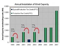 Washington DC (SPX) May 14, 2008 With the fate of a key federal incentive in the balance, the U.S. wind energy industry continued new installations at a breakneck pace in the first quarter of 2008, putting 1,400 megawatts (MW) or approximately $3 billion worth of new generating capacity in place, the American Wind Energy Association (AWEA) said in it's quarterly market report. "These new wind power plants-enough to serve the equivalent of 400,000 homes--coupled with investment in 17 new manufacturing facilities over the past year and a quarter show that - with consistent policy support - America's wind industry can deliver the goods in terms of clean energy and new clean technology jobs," commented AWEA Executive Director Randall Swisher. "But if Congress does not act quickly, this momentum could be derailed at the worst possible time for the economy, placing 76,000 jobs and over $11.5 billion in investment at risk," Swisher added. "While 2008 is shaping up to be another great year, we could see a very different story in 2009 as uncertainty looms over investment in wind power projects and manufacturing due to continuing delay in extending the production tax credit (PTC)," Swisher added. The PTC is the primary federal incentive for wind power, and expires at the end of the year along with incentives for other renewable electricity sources. The new wind power facilities installed this quarter span 10 states and bring total U.S. wind power capacity to over 18,000 MW, or enough to serve the equivalent of 5 million homes. Texas added over half this new capacity and now has well over 5,000 MW installed. Over 4,000 MW of projects are now also under construction nationwide. Additionally, AWEA reports an increase in the share of U.S.-made wind turbine components-from less than 30% to approximately 50% in three years. Prior to 2005, AWEA estimates that less than a third of components were manufactured domestically. But the relatively stable availability of the PTC since August 2005 has allowed U.S.-based supply chain providers to begin establishing a much stronger foundation of domestic manufacturing for turbine components, which range from towers and blades to gearboxes, bearings, and electrical and electronic components. AWEA estimates that, by the end of 2008, approximately half of turbine components for turbines installed in the U.S. will be produced domestically. In 2007 and early 2008, at least 17 manufacturing facilities have been brought online or expanded in the U.S., creating over 4,000 jobs and $500 million in manufacturing investment. Adjustment to final numbers for megawatts of wind power installed in the U.S. in 2007 show a slight increase to 5,249 MW, up from the 5,244 MW announced in January. Since actual installed capacity for natural gas was less than expected in 2007, new wind power facilities in fact made up close to 35% of the entire new power generating capacity added in the U.S. last year, up from the 30% initially reported in January. In June, the WINDPOWER 2008 Conference and Exhibition will open in Houston, in the heart of the energy capital of Texas, now the state with the largest wind power market in the nation. WINDPOWER 2008 will be the U.S.'s biggest wind industry show ever, with over 8,000 attendees and 700 exhibitors, including leading global wind turbine manufacturers and many component and supply chain providers. Community Email This Article Comment On This Article Share This Article With Planet Earth
