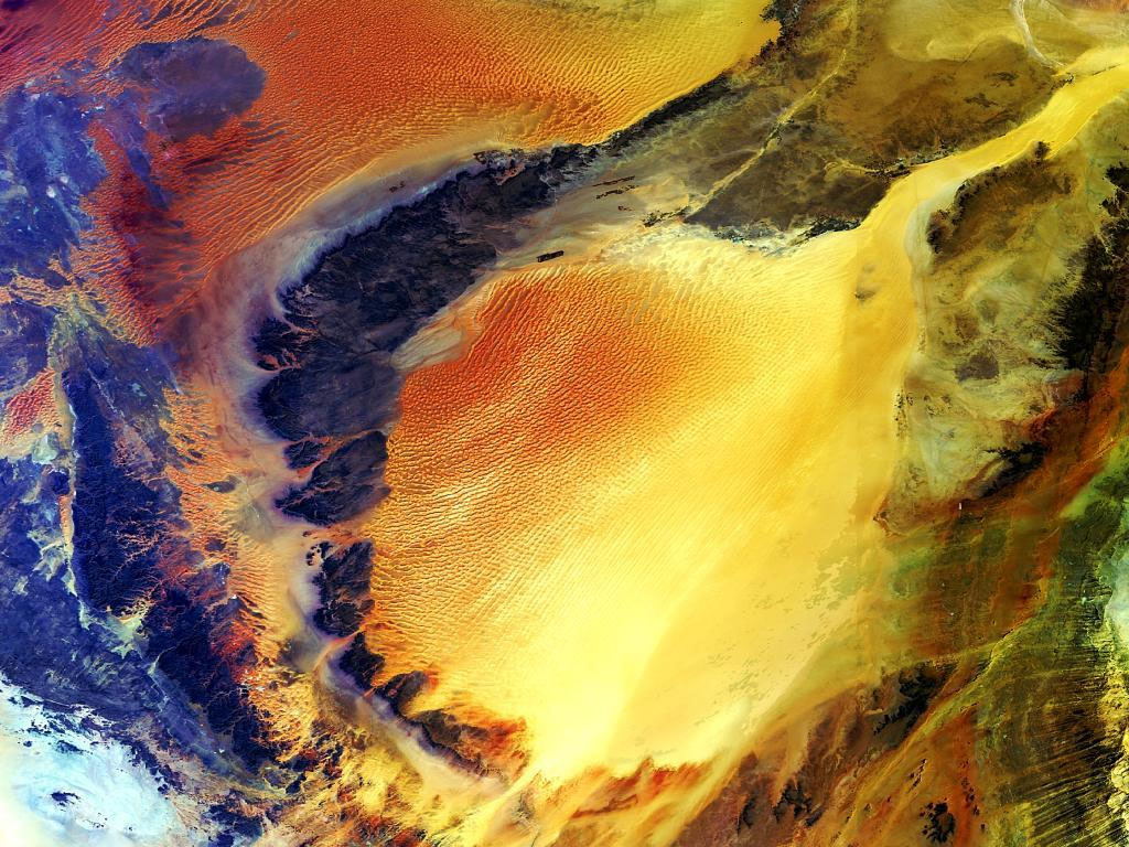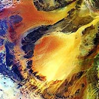 Paris (ESA) Mar 29, 2005 This Envisat image shows two huge sand dune seas in the Fezzan region of southwestern Libya, close to the border with Algeria. Most of the face of the Sahara desert stretching across Northern Africa is bare stone and pebbles rather than sand dunes, but there are exceptions � sprawling sea of multi-storey sand dunes known as 'ergs'. The Erg Ubari (also called Awbari) is the reddish sand sea towards the top of the image. A dark outcrop of Nubian sandstone separates the Erg Ubari sand from the Erg Murzuq (also called Murzuk) further south. A persistent high-pressure zone centred over Libya keeps the centre of the Sahara completely arid for years at a time, but research has discovered evidence of 'paleolakes' in this region associated with a wetter and more fertile past. Libya today has no permanent rivers or water bodies, but has various vast fossil aquifers. These natural underground basins hold enormous amounts of fresh water. Two decades ago an ambitious project called Great Man-Made River was begun, aimed at drawing water from the aquifers beneath the Fezzan region shown in the image, via a network of underground pipes for irrigation in the coastal belt. Upon completion the huge network of pipelines will extend to about 3,380 km. Envisat's Medium Resolution Imaging Spectrometer (MERIS), working in Full Resolution mode to provide a spatial resolution of 300 metres, acquired this image on 24 November 2004. It has a width of 672 kilometres. Community Email This Article Comment On This Article Related Links Envisat overview SpaceDaily Search SpaceDaily Subscribe To SpaceDaily Express Earth Observation News - Suppiliers, Technology and Application