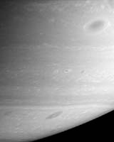Pasadena CA (SPX) Mar 27, 2006 NASA's Cassini spacecraft captured this image of Saturn's atmosphere alive with a multitude of dark vortices swirling through its southern hemisphere. Scientists have learned that vortices are long-lived features on Saturn, part of the general circulation of the giant planet's atmosphere. Vortices are thought to be caused by the shear between eastward- and westward-flowing jets -- the alternating bands flowing past each other in the atmosphere. The vortices can last for months or years and probably grow by merging with other vortices until a few dominate a particular zone of wind shear between two jets. The vortex at upper right is one of the largest seen on Saturn. Cassini took the image on Feb. 16 with its narrow-angle camera, at a distance of approximately 3.2 million kilometers (2 million miles) from Saturn. The image scale is 19 kilometers (12 miles) per pixel. Community Email This Article Comment On This Article Related Links Cassini at JPL Cassini Image Team Explore The Ring World of Saturn and her moons Jupiter and its Moons The million outer planets of a star called Sol News Flash at Mercury