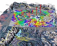 Salt Lake City UT (SPX) Nov 09, 2007 The Yellowstone "supervolcano" rose at a record rate since mid-2004, likely because a Los Angeles-sized, pancake-shaped blob of molten rock was injected 6 miles beneath the slumbering giant, University of Utah scientists report in the journal Science. "There is no evidence of an imminent volcanic eruption or hydrothermal explosion. That's the bottom line," says seismologist Robert B. Smith, lead author of the study and professor of geophysics at the University of Utah. "A lot of calderas [giant volcanic craters] worldwide go up and down over decades without erupting." The upward movement of the Yellowstone caldera floor - almost 3 inches (7 centimeters) per year for the past three years - is more than three times greater than ever observed since such measurements began in 1923, says the study in the Nov. 9 issue of Science by Smith, geophysics postdoctoral associate Wu-Lung Chang and colleagues. "Our best evidence is that the crustal magma chamber is filling with molten rock," Smith says. "But we have no idea how long this process goes on before there either is an eruption or the inflow of molten rock stops and the caldera deflates again," he adds. The magma chamber beneath Yellowstone National Park is a not a chamber of molten rock, but a sponge-like body with molten rock between areas of hot, solid rock. Chang, the study's first author, says: "To say if there will be a magma [molten rock] eruption or hydrothermal [hot water] eruption, we need more independent data." Calderas such as Yellowstone, California's Long Valley (site of the Mammoth Lakes ski area) and Italy's Campi Flegrei (near Naples) huff upward and puff downward repeatedly for decades to tens of thousands of years without catastrophic eruptions. Smith and Chang conducted the study with University of Utah geophysics doctoral students Jamie M. Farrell and Christine Puskas, and with geophysicist Charles Wicks, of the U.S. Geological Survey in Menlo Park, Calif. Yellowstone: A Gigantic Volcano Atop a Hotspot Yellowstone is North America's largest volcanic field, produced by a "hotspot" - a gigantic plume of hot and molten rock - that begins at least 400 miles beneath Earth's surface and rises to 30 miles underground, where it widens to about 300 miles across. There, blobs of magma or molten rock occasionally break off from the top of the plume, and rise farther, resupplying the magma chamber beneath the Yellowstone caldera. Previous research indicates the magma chamber begins about 5 miles beneath Yellowstone and extends down to a depth of at least 10 miles. Its heat powers Yellowstone's geysers and hot springs - the world's largest hydrothermal field. As Earth's crust moved southwest over the Yellowstone hotspot during the past 16.5 million years, it produced more than 140 cataclysmic explosions known as caldera eruptions, the largest but rarest volcanic eruptions known. Remnants of ancient calderas reveal the eruptions began at the Oregon-Idaho-Nevada border some 16.5 million years ago, then moved progressively northeast across what is now the Snake River Plain. The hotspot arrived under the Yellowstone area sometime after about 4 million years ago, producing gargantuan eruptions there 2 million, 1.3 million and 642,000 years ago. These eruptions were 2,500, 280 and 1,000 times bigger, respectively, than the 1980 eruption of Mount St. Helens. The eruptions covered as much as half the continental United States with inches to feet of volcanic ash. The most recent giant eruption created the 40-mile-by-25-mile oval-shaped Yellowstone caldera. The caldera walls have eroded away in many areas - although they remain visible in the northwest portion of the park. Yellowstone Lake sits roughly half inside and half outside the eroded caldera. Many smaller volcanic eruptions occurred at Yellowstone between and since the three big blasts, most recently 70,000 years ago. Smaller steam and hot water explosions have been more frequent and more recent. Measuring a Volcano Getting Pumped Up In the new study, the scientists measured uplift of the Yellowstone caldera from July 2004 through the end of 2006 with two techniques: Twelve Global Positioning System (GPS) ground stations that receive timed signals from satellites, making it possible to measure ground uplift precisely. The European Space Agency's Envisat satellite, which bounces radar waves off the Yellowstone caldera's floor, another way to measure elevation change. The measurements showed that from mid-2004 through 2006, the Yellowstone caldera floor rose as fast as 2.8 inches (7 centimeters) per year - and by a total of 7 inches (18 centimeters) during the 30-month period, Chang says. "The uplift is still going on today but at a little slower rate," says Smith, adding there is no way to know when it will stop. Smith says the fastest rate of uplift previously observed at Yellowstone was about 0.8 inch (2 centimeters) per year between 1976 and 1985. He says that Yellowstone's recent upward motion may seem small, but is twice as fast as the average rate of horizontal movement along California's San Andreas fault. The current uplift is faster than ever observed at Yellowstone, but may not be the fastest ever, since humans weren't around for its three supervolcano eruptions. Chang, Smith and colleagues conducted computer simulations to determine what changes in shape of the underground magma chamber best explained the recent uplift. The simulations or "modeling" suggested the molten rock injected since mid-2004 is a nearly horizontal slab - known to geologists as a sill - that rests about 6 miles (10 kilometers) beneath Yellowstone National Park. The slab sits within and near the top of the pre-existing magma chamber, which resembles two anvil-shaped blobs expanding upward from a common base. Smith describes the slab's computer-simulated shape as "kind of like a mattress" about 38 miles long and 12 miles wide, but only tens or hundreds of yards thick. 